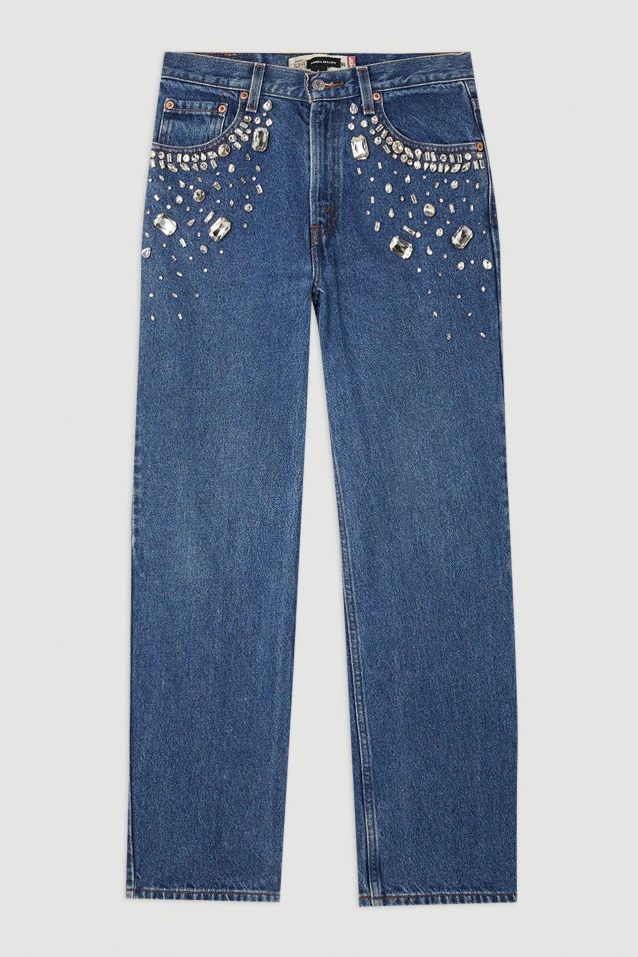Tanya - Rhinestone Embellished Wide Leg Jeans - Dark Blue